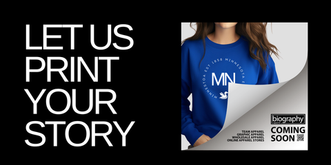 Our transition includes growing the apparel offerings you currently find in-store and online. We’re expanding our production facilities, and re-vamping our website. Our retail store will be open in the same location, with more team apparel, Minnesota-themed apparel, Chards (Chad’s cards) and our own graphic apparel in a variety of fun styles. Our website will feature new options for online apparel store hosting for teams & businesses. We’ll introduce more wholesale/bulk apparel ordering options. We’re excited to grow our partnerships, fundraisers, and offerings as Biography Apparel. We’d love the opportunity to help print YOUR story.