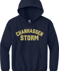 Deep Navy Youth Hoodie, in a heavyweight, soft fabric, featuring varsity-style Chanhassen Storm text in gold. 50/50 cotton/poly